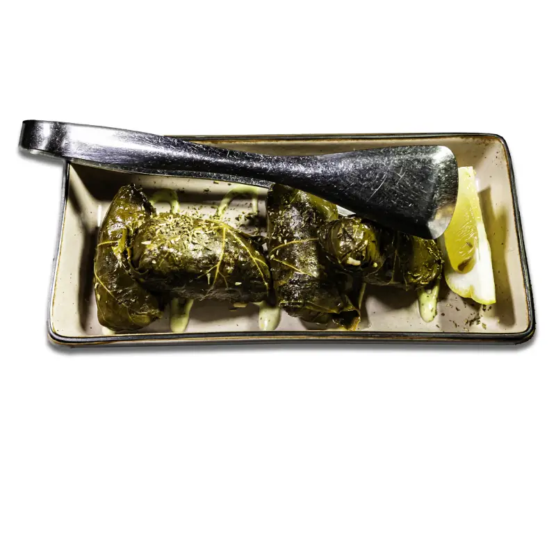 Dolmades, wrapped Cretan vine leaves stuffed with a zesty filling of medium grain rice mixed with shredded seasonal vegetables & herbs. Served with a dill & yogurt dip